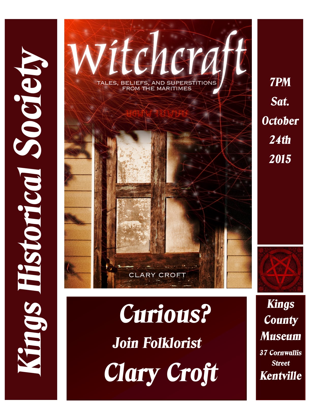 The Kings Historical Society presents an evening with famed folklorist, writer and entertainer CLARY CROFT exploring Witchcraft! The subject evokes curiosity, fascination, and sometimes, abhorrence. In the Maritimes, a region with a rich tradition of storytelling, accounts of witchcraft are abundant. Folklorist CLARY CROFT will explore some of the many examples of witchcraft identified in the Maritimes and explain their cultural origins-Scottish, Mi’kmaq, Acadian, German, among others. He will offer examples of spells, charms, and superstitions involving everything from animal horns and blood to salt and milk. Croft will also trace witchcraft’s more official history from the Maritimes’ first witch trial in 1684 to the the trial of Jean Campagna-followed by others throughout the eighteenth, nineteenth, and twentieth centuries.CROFT’S book Witchcraft is a thoroughly researched history of an often-misunderstood practice and a rich source of Maritime folklore.