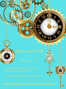 Kings Historical Society’s AGM will take place on June 28 at 7:30 p.m.. Everyone is invited to bring along their best story and vintage finds, there will be a show and tell following the meeting.