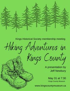 Jeff Newbury, a local educator, hiking enthusiast and natural history buff will discuss possible adventures close to home at the May membership meeting of the Kings Historical Society. All are welcome! Meeting starts at 7:30 p.m.