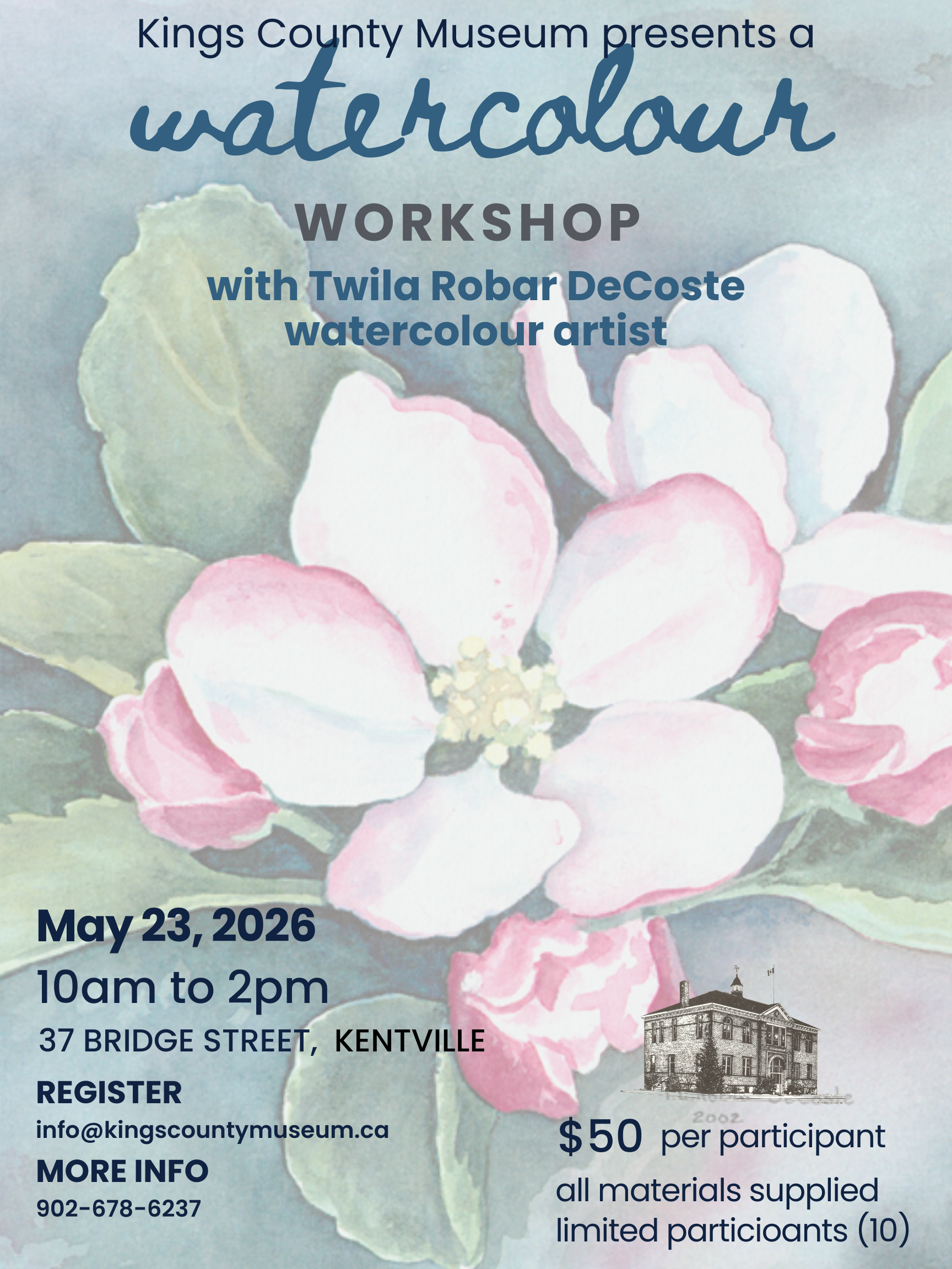 In this hands-on workshop participants will paint watercoloured apple blossoms on 5.5 x 7.5 cold pressed 140 lb paper (provided). All necessary brushes and paint will be supplied.